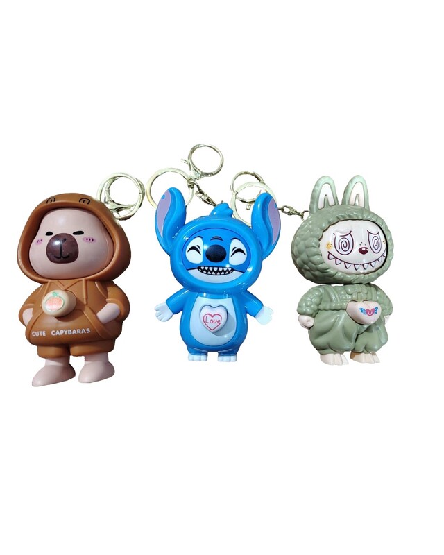 Llaveros de Labubu, Stitch y Capybara hechos en plástico resistente en variantes de muchos colores. Cuenta con un boton que hace girar su rostro cambiando a distintas expresiones. ideal regalos