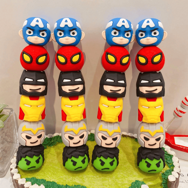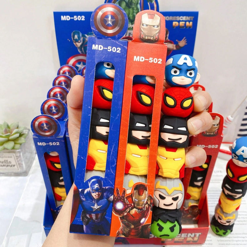 Set de 6 resaltadores de colores distintos con forma de cabezas de superheroes de Marvel y DC. Se encastran entre si para Formar una torre