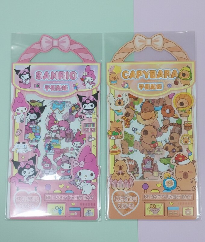 planchas de sticker de los personajes Capybara y Kuromi. De alta calidad y presentacion estetica. Precio por unidad.