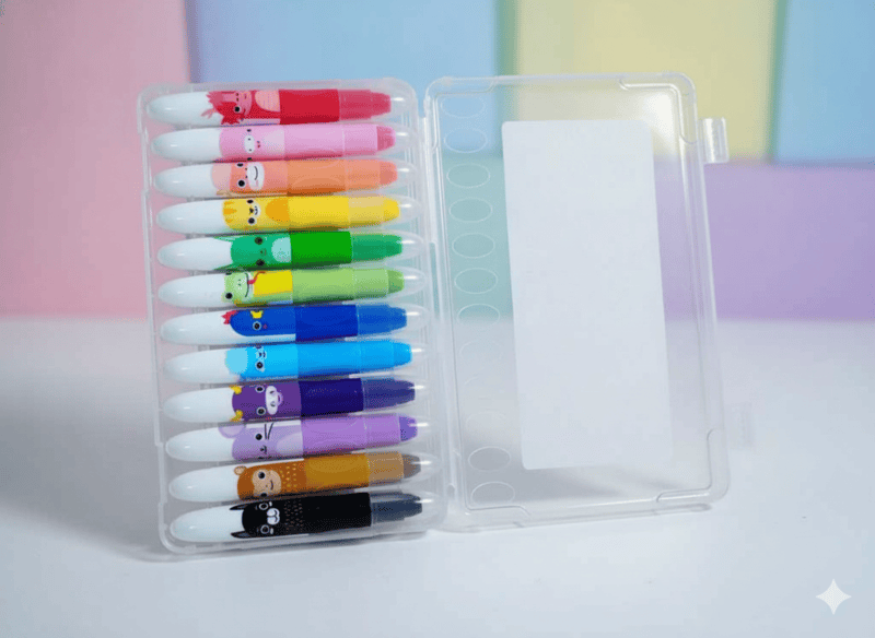 Caja de x12 crayones con movitvos de animales. Presentacion en caja transparente de alta calidad, retraibles y extendibles.