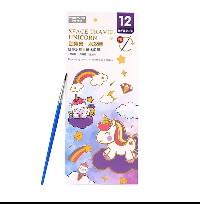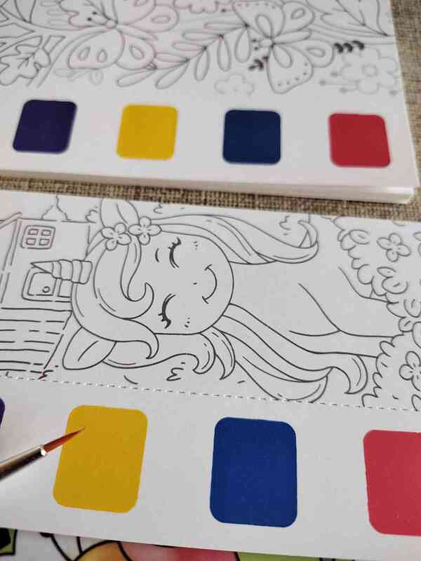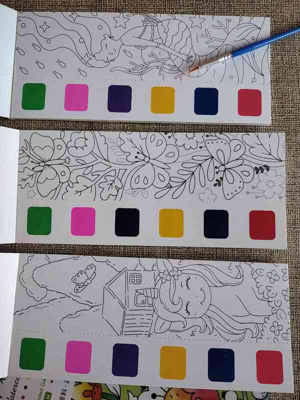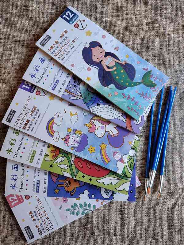 cada kit del blister cuenta con su propio pincel, sus acuarelas que vienen integradas a cada dibujo del set para poder pintar. el blister cuenta con 8 kits.