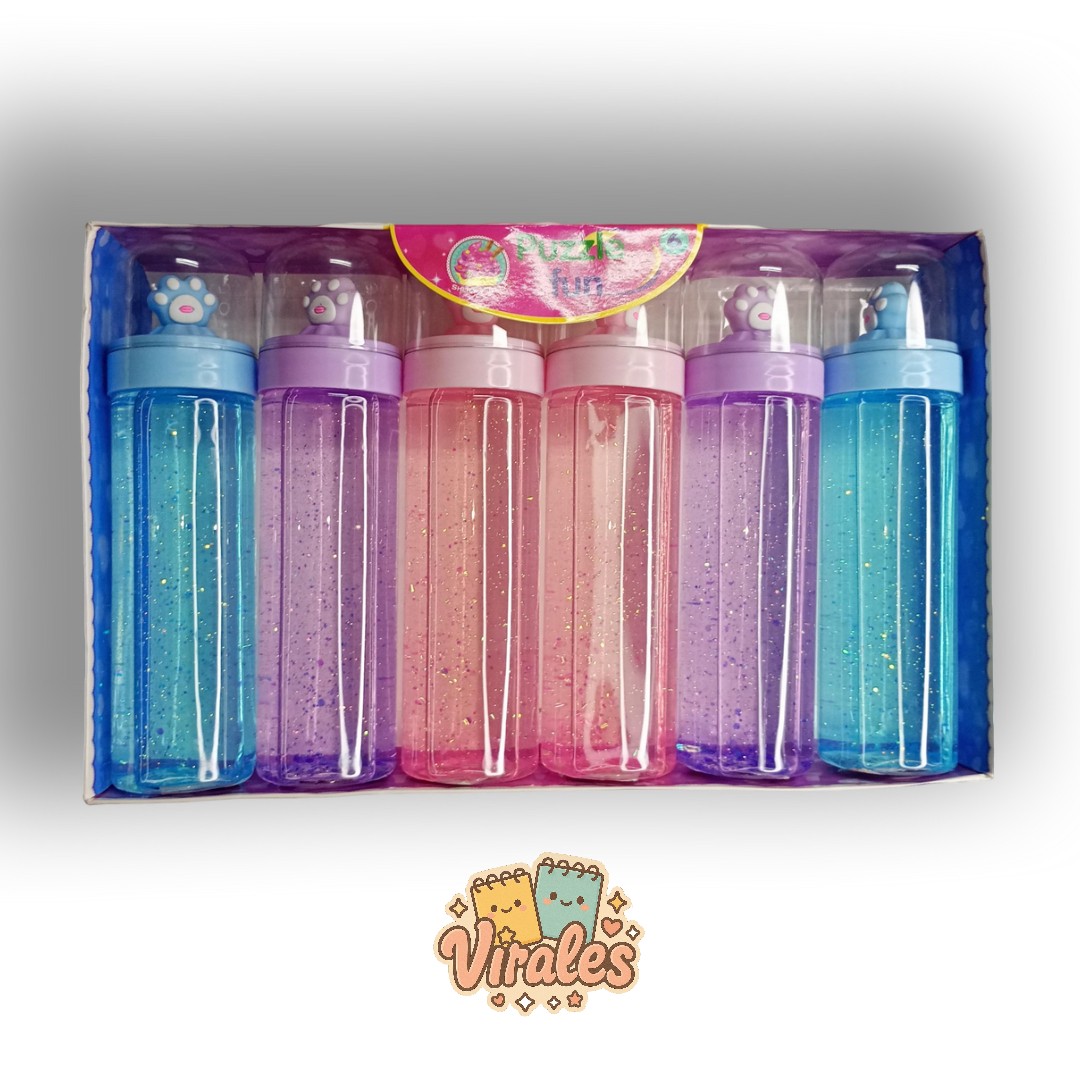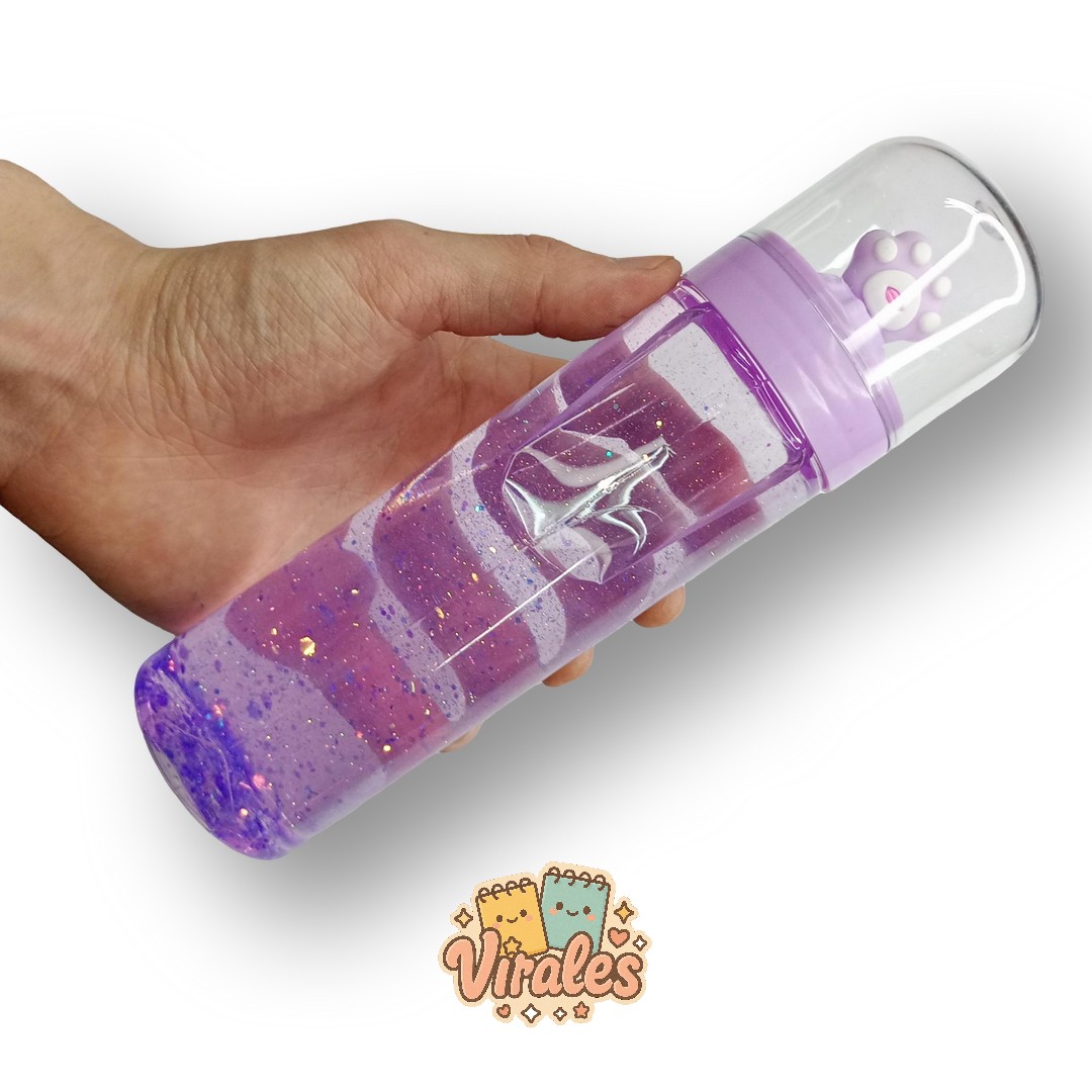 slime en frasco estetico de huellita de gato semitransparente en colores azul rosa y violeta, con brillos metalizados contenido del frasco 500cm3