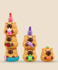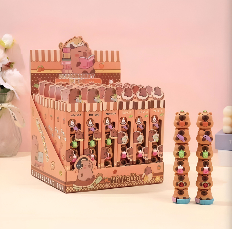 Blister de 6 resaltadores de cabezas de capybaras en distintos colores, apilables.