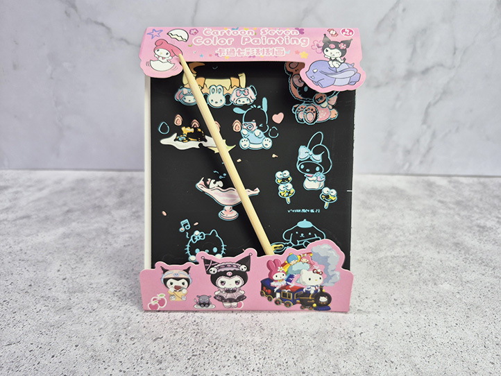 Papel mágico con rascador de Kuromi, al rascar devela los colores de la imagen. incluye rascador de madera.